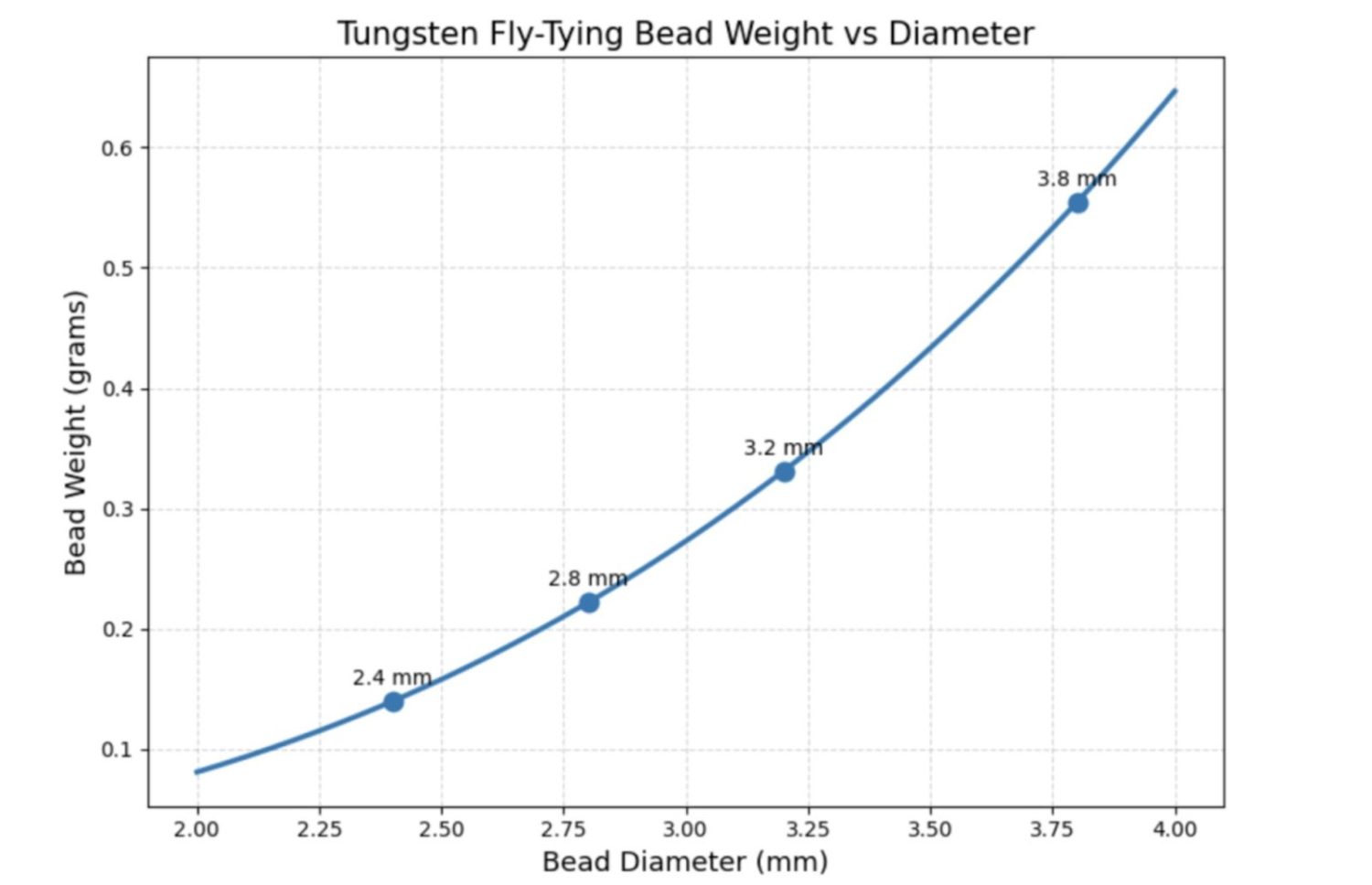 The difference in weight as you go up in bead size changes more quickly than you may think! The actual weight trend of our beads will look a bit different due to the variance in slot sizes for different beads. In most cases, the slot takes up a lower percentage of volume the larger the bead gets, so the actual weight difference between our flies is even more drastic!